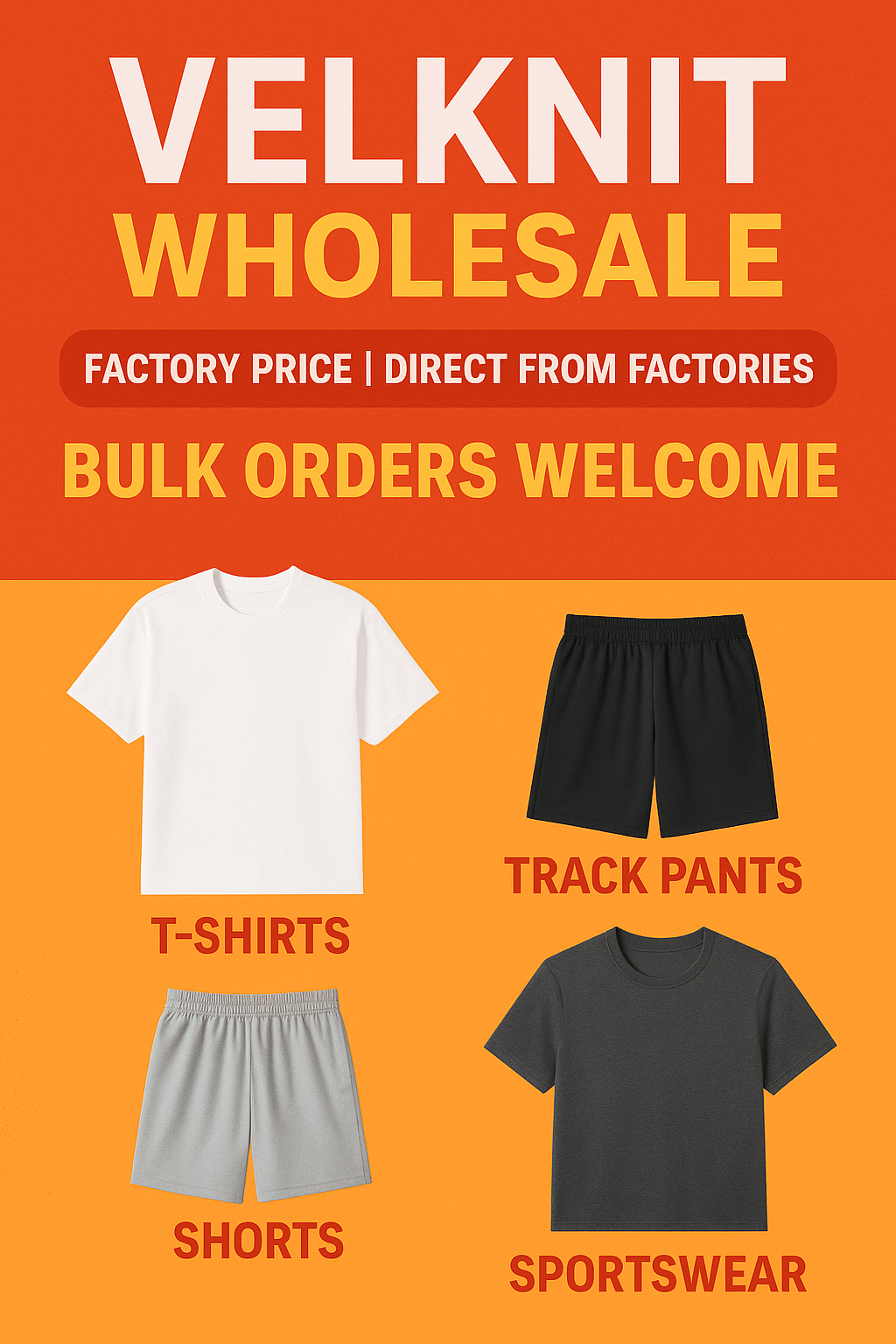 At VelKnit Wholesale, we offer a wide range of quality knitwear directly from the factory — T-shirts, Track Pants, Shorts, and Sportswear at unbeatable wholesale prices.
